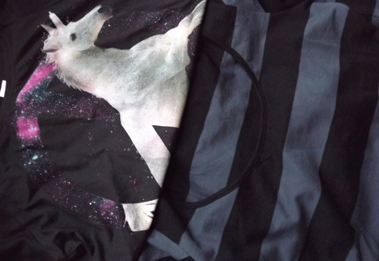 J’ai aussi pris deux tee shirts de chez H&M, sur le thème des licornes. Je les ai trouvés tous les deux dans le rayon divided, même si celui couleur menthe a l’air de venir de chez les enfants. 🙂 Ils coûtent 5 euros pour le peace-galaxie-licorne-coupe étrange (soldé) et 15 euros pour le petit poney.