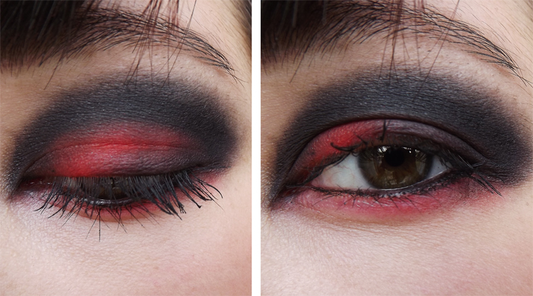 Je me suis souvenue que la demoiselle avait une fois fait un smoky rouge, et banco, j’étais lancée. Comme d’habitude, j’ai fait un peu au hasard, en rajoutant un peu de noir par ci, par là, jusqu’à ce que ça me plaise. Ca correspond peut être pas mal à l’esprit rock, vu que ça me fait penser à des gens qui font ce que bon leur semble. ^^
