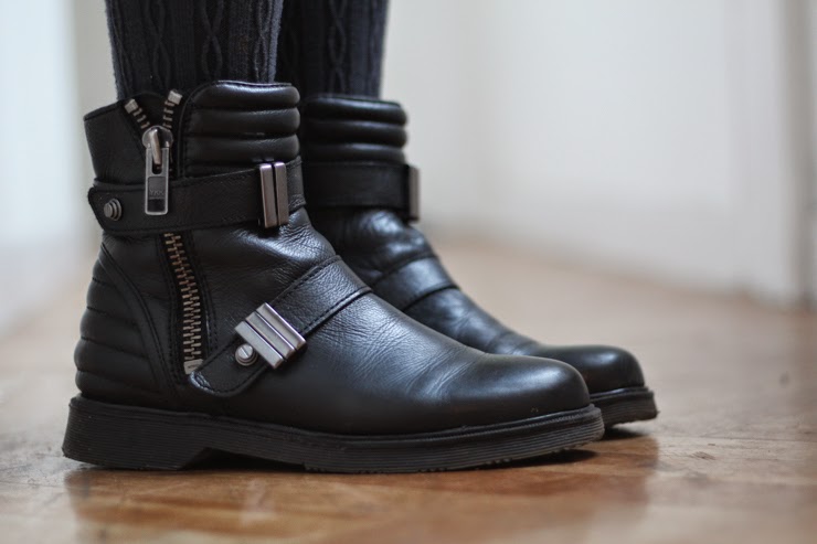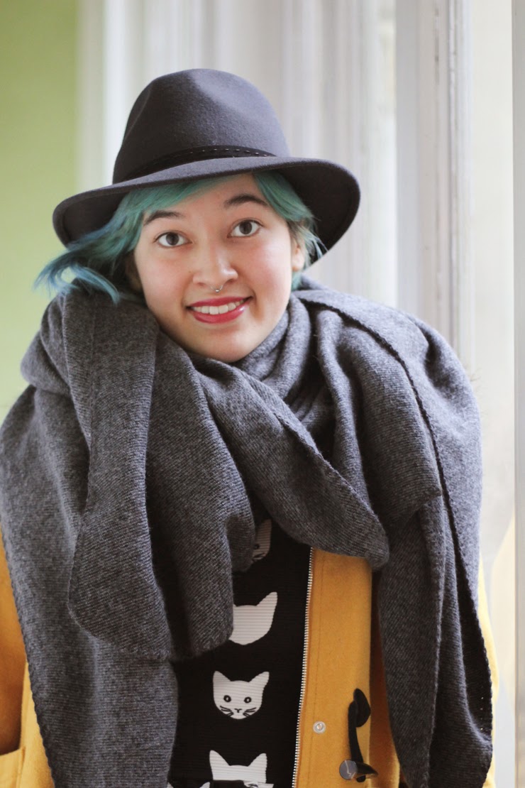 Chapeau Cappellificio Falcus / Echarpe Asos (vue ici) / Duffle coat jaune Bershka / Robe H&M (old) / Collant H&M / Boots Eram / Tote bag Primark