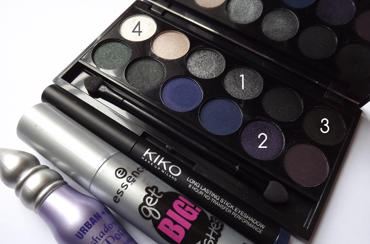 J’ai posé le gris métallisé (1) en coin interne, le violet (2) au milieu de la paupière mobile et le noir mat (3) pour estomper et foncer sur l’extérieur. Et le blanc métallisé en touche lumière.
