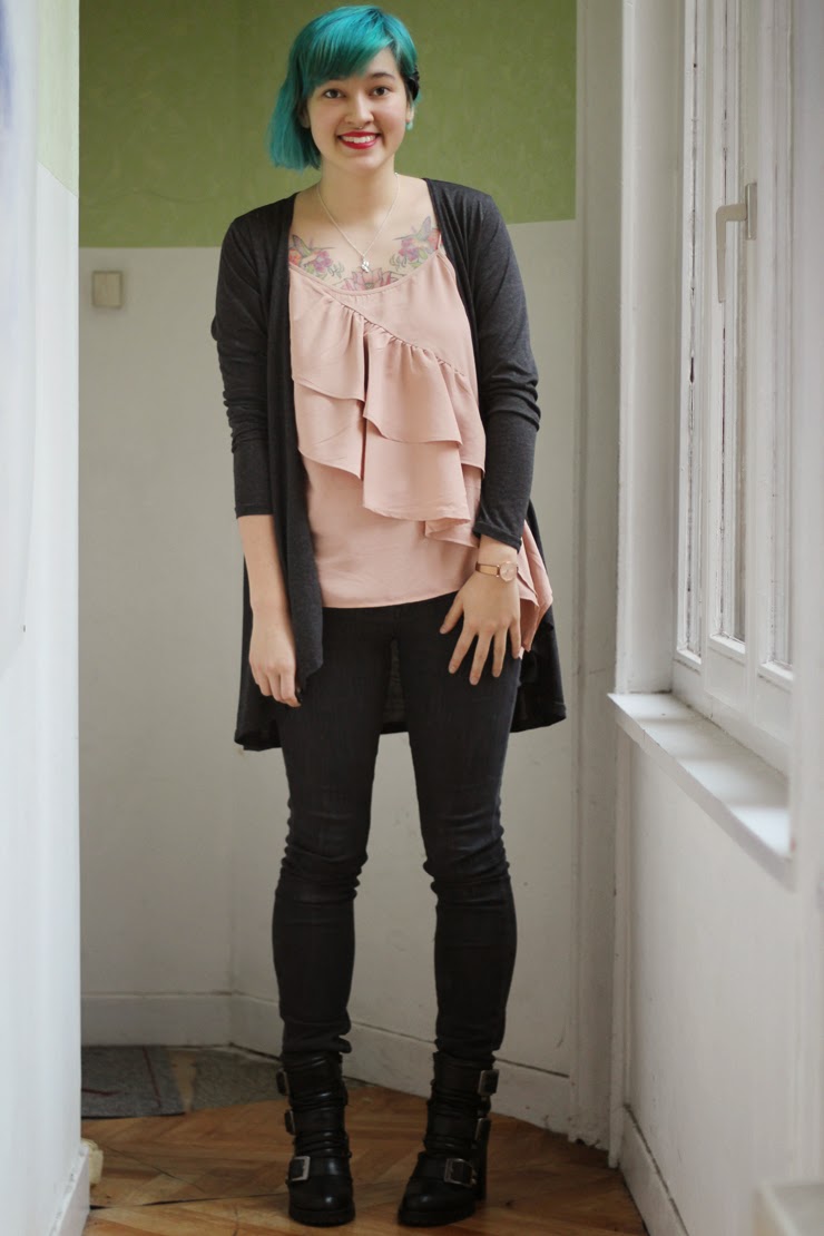 Ici, c’est une tenue assez sobre, presque chic (pour moi) et j’aime bien le porter sur du preppy ou du rock. Le côté fluffy évite la vulgarité je trouve, et c’est facile de s’habiller comme on veut au final.